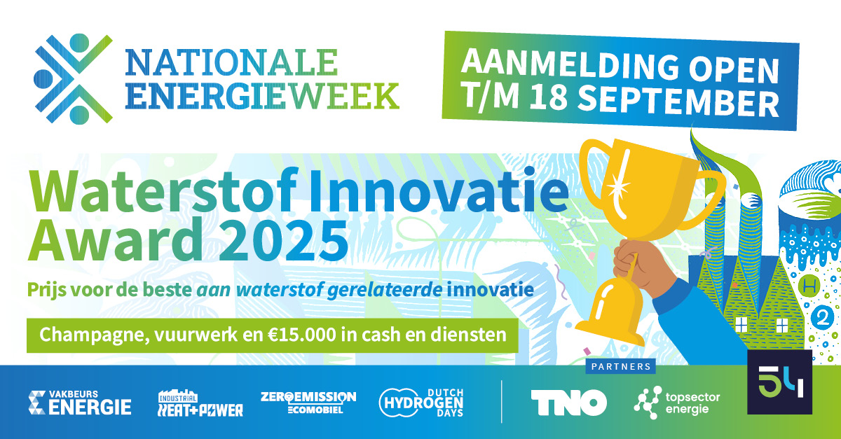 Aanmelden voor de Waterstof Innovatie Award 2025 kan tot en met donderdag 18 september 2025 - door op onderstaande knop te klikken en vervolgens het inschrijfformulier in te vullen.